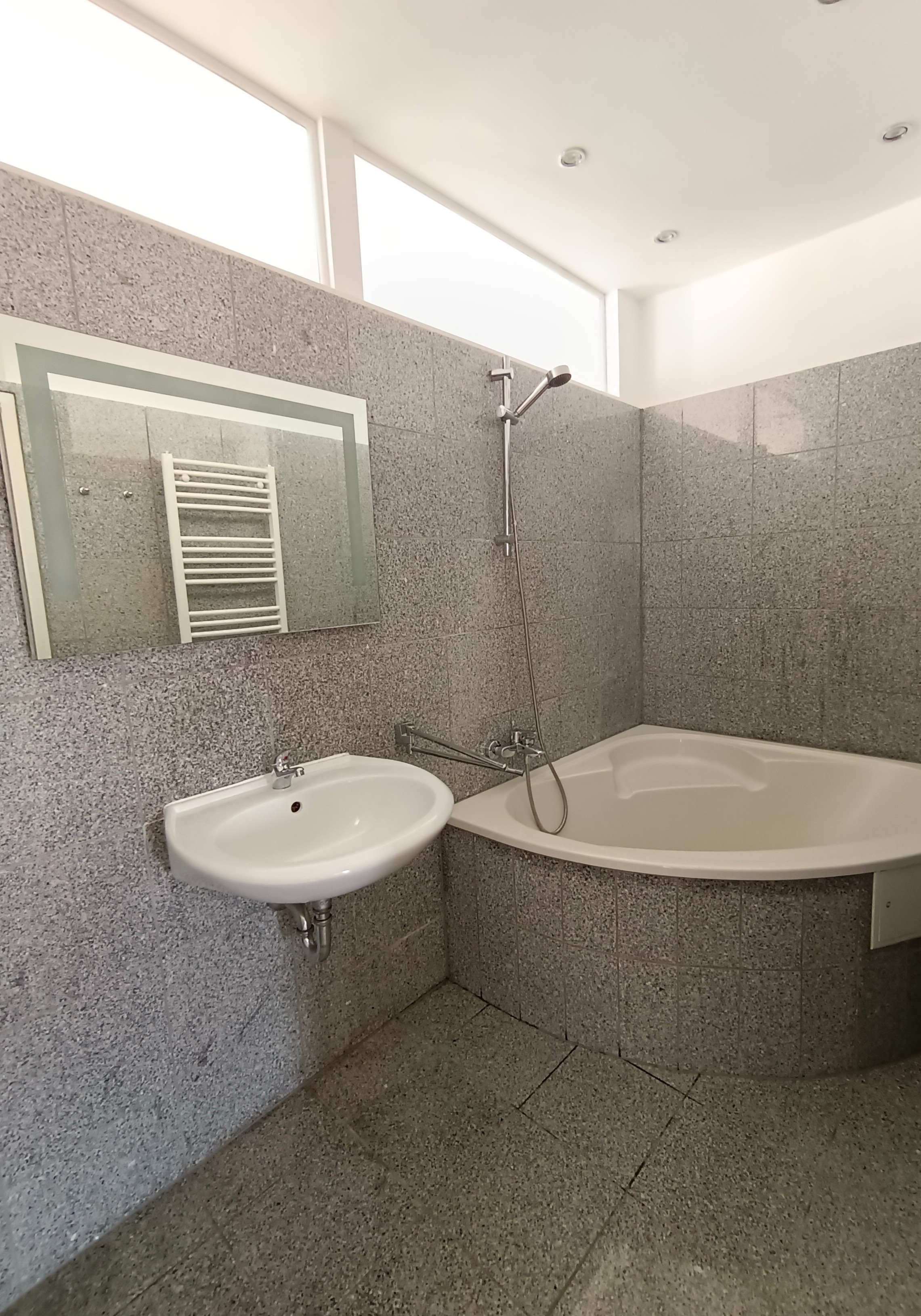 – Badezimmer mit Eckwanne und Waschmaschinenanschluss