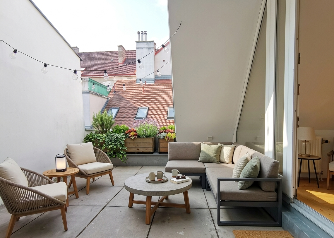Dachterrassenmiete in Stilaltbau – fussläufig zum Filmfestival – Nähe Rathaus – Schiffboden – KEINE WG-Eignung – Nähe Theater in der Josefstadt – begehrte Bezirkslage in City Nähe