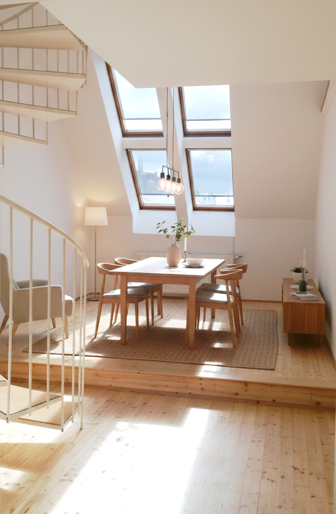 Durch die wenigen hoch angesetzten Dachschrägen wird optimale Raumnutzung ermöglicht. Die Querbelüftung und die Beschattung durch integrierten Sonnenschutz sorgen ausserdem für äusserst angenehmens Raumklima.